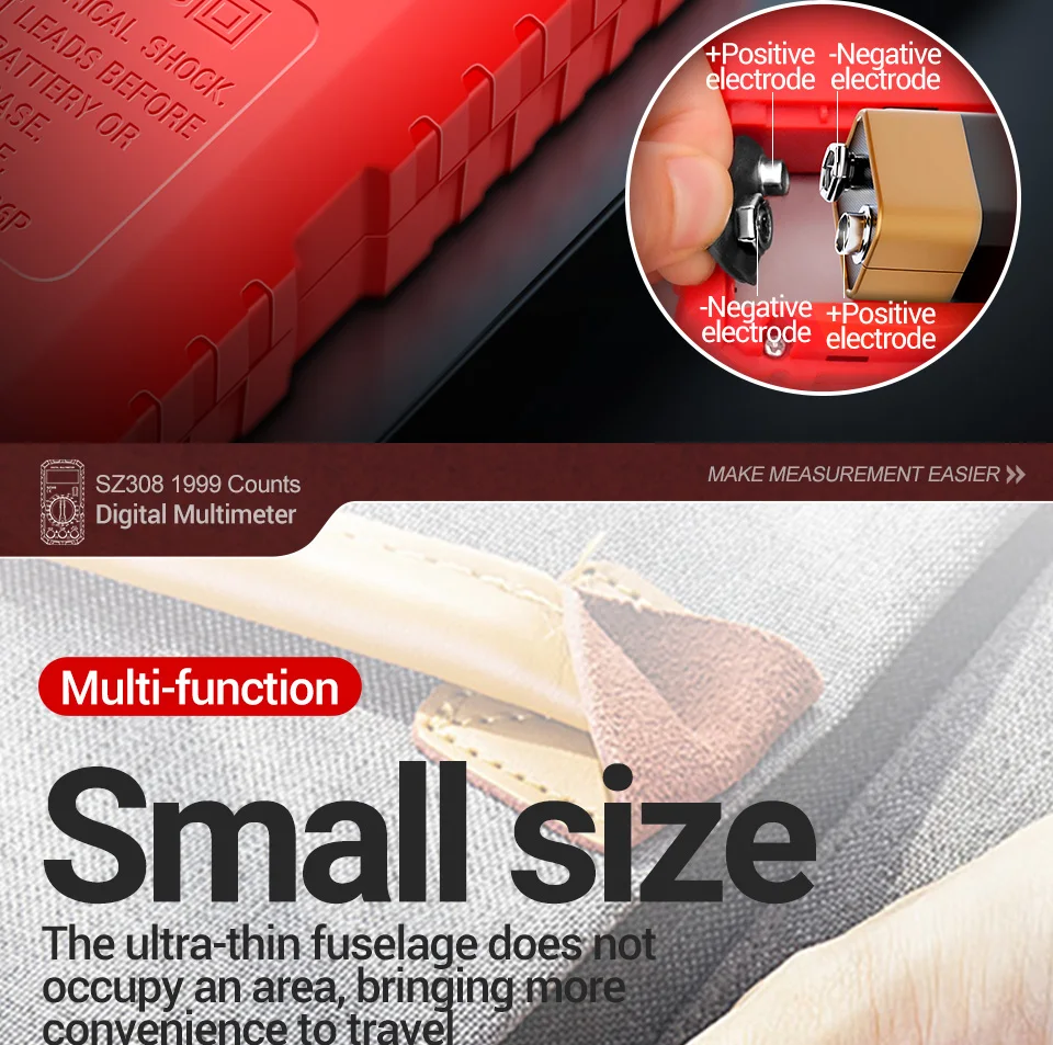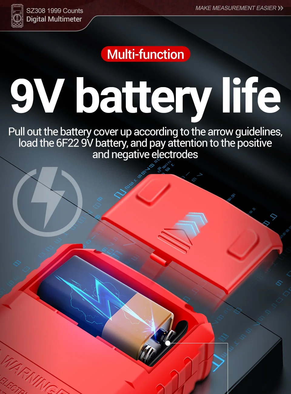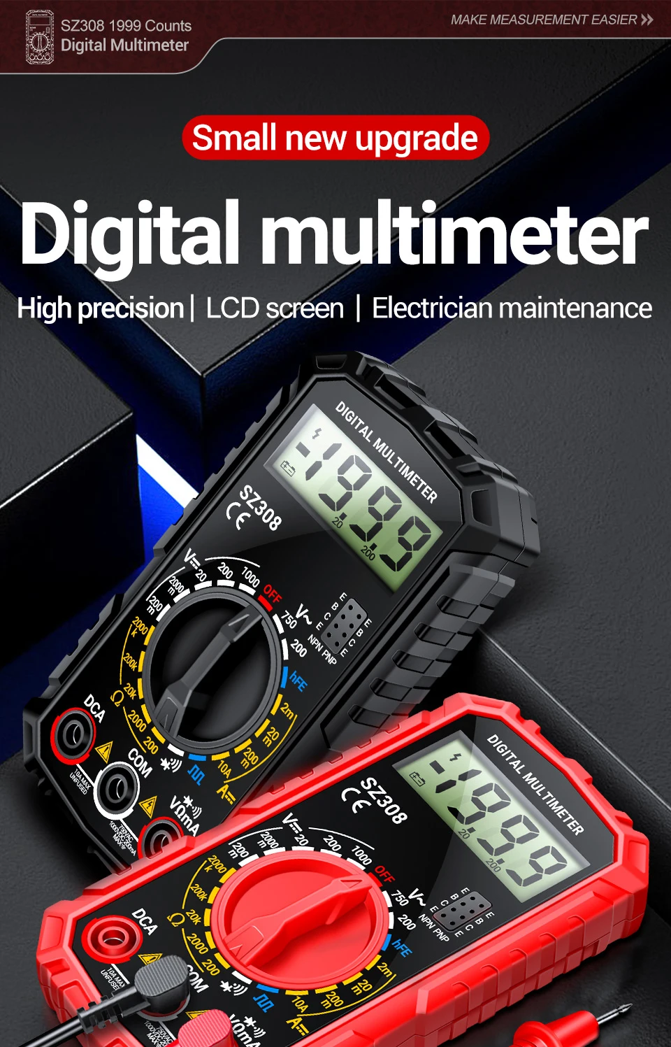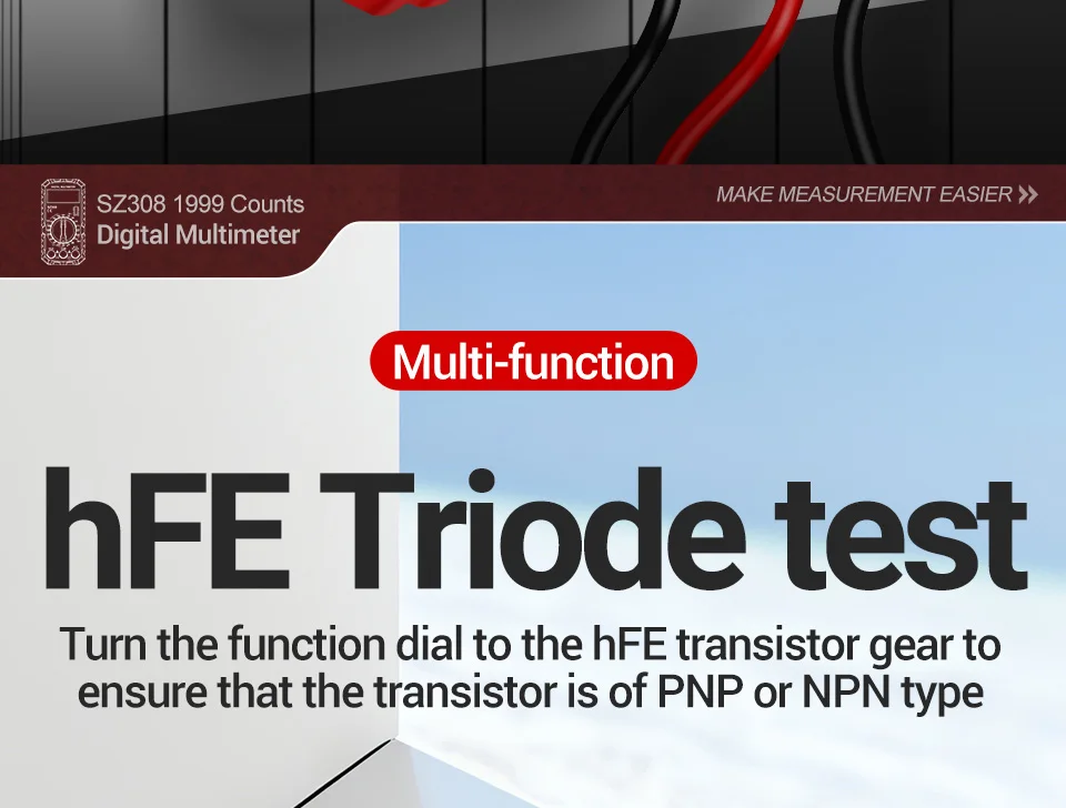 El SZ308 es un multímetro digital portátil, diseñado y fabricado según las normas internacionales de seguridad eléctrica. Se utiliza para medir voltaje CA/CC, corriente CA/CC, resistencia, capacitancia, salida de onda cuadrada de diodos y transistores HFE, entre otras funciones.